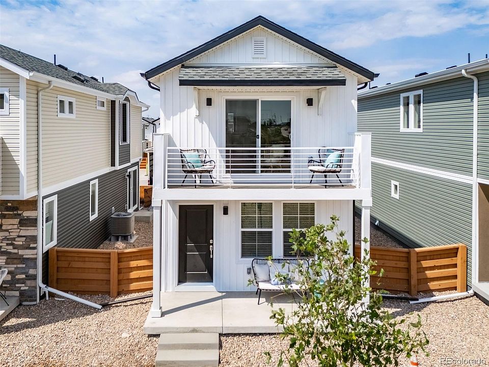 Welcome to the Newton – Modern Living in Reunion. Take advantage of $10K Flex Cash when using our preferred lender! Restrictions apply. See sales counselor for details. This thoughtfully designed 1,166 sq. ft. home offers 3 bedrooms, 2 bathrooms, and a flexible layout that adapts to your lifestyle. Step onto the charming front porch—perfect for morning coffee in the fresh Colorado air. Inside, a versatile flex space can be customized as a home office, fitness nook, play area, or creative studio. Two bedrooms and a full bathroom are also located on the main floor. A sliding glass door off the flex room leads to your private, fully fenced backyard—great for grilling or a small garden. Upstairs, retreat to the spacious primary suite with a private bathroom and a layout designed for comfort and privacy. At the heart of the home, the kitchen features a generous eat-in island, ample cabinet space, and Bengal White granite countertops—perfect for everything from breakfast to meal prep. The stainless-steel appliance package includes a freestanding range, canopy hood, microwave, French door refrigerator, and dishwasher. The open-concept living room on the upper level is perfect for relaxing or entertaining, filled with natural light. Just off the living room, step onto your private balcony—ideal for quiet moments with a cup of coffee. Additional features include Shaker Glacier White cabinets with soft-close drawers, satin nickel cabinet pull bars, Bengal White granite in the bathrooms, and window coverings on main windows.