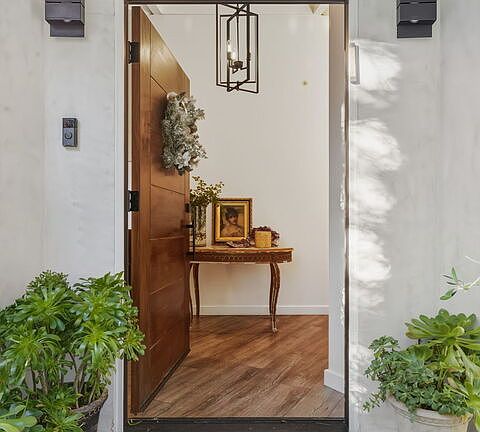 Striking Mid-Century Haven with Expansive Pool, Privacy & Canyon Views. Tucked behind a gated entrance off Upper Mandeville Canyon Road, this striking mid-century residence sits on a lush 12,455-square-foot lot dotted with mature myrtle and pepper trees. Thoughtfully expanded and remodeled, the 2,888 sqft architectural home blends timeless design with dramatic natural surroundings. Inside, ash veneer floors, pitched beam ceilings, skylights, and custom steel-framed windows and doors create a seamless indoor-outdoor experience, reflecting the expansive pool, patios, and serene canyon vistas beyond. The open living, dining, and family spaces offer warmth, flow, and abundant natural light, anchored by a luminous formal entry and double-sided fireplace. The chef's kitchen is a showstopper, wrapped in wide picture windows framing verdant nature and outfitted with stainless steel appliances, a center island, quartz countertops, and generous pantry storage. Ideal for entertaining, the layout connects effortlessly to both interior gathering areas and the outdoor oasis. A private bedroom wing features two guest bedrooms and a beautifully appointed shared bath with double vanity and custom tilework. The luxurious primary suite is a tranquil retreat, boasting clerestory windows, a spa-inspired bath with a freestanding tub and open shower, an oversized walk-in closet, and French steel doors that open directly to the pool. Additional highlights include an oversized two-car garage with 420 sqft of flexible utility space or studio potential, serpentine pavers surrounding the home, and a rare sense of serenity just moments from Brentwood's coveted dining/shopping scene.