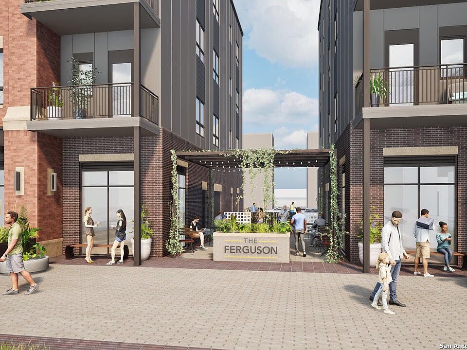 Welcome to The Milliner floorplan at The Ferguson, a new condominium community in the heart of Taylor, Texas. This 4th floor corner residence features soaring 11 ft ceilings and expansive windows that flood the space with natural light. The thoughtfully designed kitchen showcases Italian cabinetry with elegant glass front cabinet doors, sleek black Bosch appliances, including a 5-burner gas cooktop, convection microwave oven, and refrigerator with ice and water dispenser, along with a spacious pantry and pull-out trash/recycle storage. Perfect for entertaining, the generous dining area comfortably accommodates 8-10 guests. The primary suite is privately situated and includes a walk-in closet and bathroom with dual vanities as well as grout-less, Skema tiles. A separate study provides an ideal space for work or reading, while a balcony off the living room offers a relaxing outdoor space. Residents will also enjoy the convenience of first floor retail, including a planned restaurant. Located just minutes from downtown and only 8 minutes to the Samsung plant, The Ferguson blends small town charm with modern convenience in the growing community of Taylor. The most affordable, new condominiums in the Austin submarket. Enjoy a slower pace of life in small town living with an abundance of opportunities. Construction starting in late summer with delivery in 18-22 months. Reserve your space now and enjoy discounted pre-construction pricing.