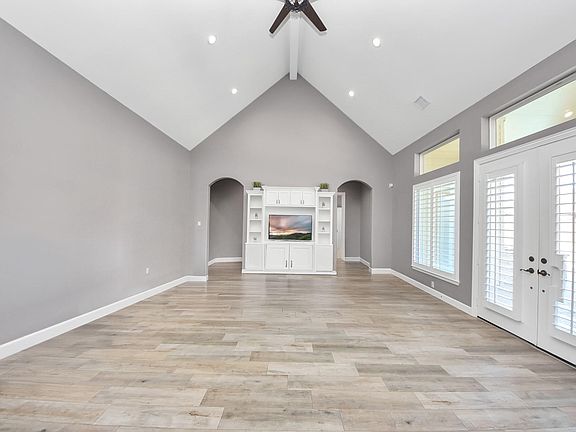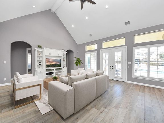 Exquisite craftsmanship meets modern luxury in stunning home on a 20,000+ sq. ft. cul-de-sac lot. Interiors feature 8-foot doors, wood-look tile floors, vaulted ceilings, crown molding, and a neutral palette. The gourmet kitchen boasts custom cabinetry, stainless steel appliances, walk-in pantry with glass door, and oversized island with undermount sink & flows seamlessly to the family room and breakfast nook. Retreat to the primary suite with a wall of windows, plush carpet, spa-inspired bath with dual sinks, soaking tub, walk-in shower, and expansive custom closet. Secondary bedrooms offer ensuite baths, while a flexible fifth bedroom/study provides versatility. Outdoor amenities include a sparkling pool, huge vaulted patio, covered kitchen and bar, custom putting green, and plenty of yard space. Air-conditioned oversized garage, mudroom, utility room in house, dedicated dog room with private access to backyard, and whole-house water softener complete this exceptional residence.