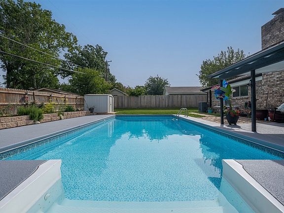 The oversized primary suite offers a versatile sitting area or office space, perfect for relaxing or working from home. A bright sunroom off the back leads to a large covered metal patio and a sparkling pool that gradually slopes from 3 feet to around 7.5 feet—ideal for summer fun!