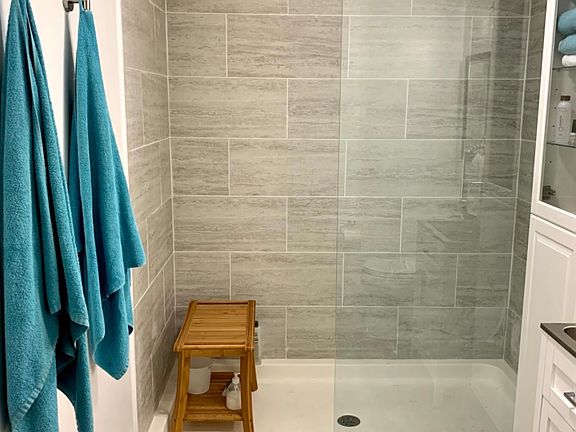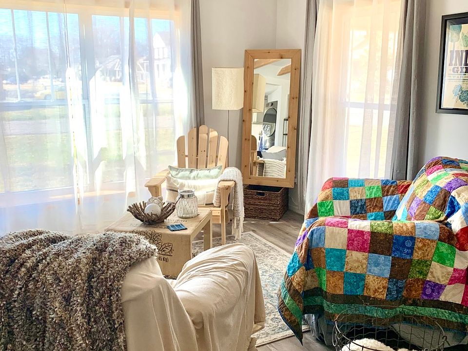 This is a studio space with lots of natural light and an open layout, featuring large windows and sheer drapery throughout (as well as room-darkening panels for late sleepers). If you enjoy the modern-meets-rustic aesthetic, you will love this place! The bathroom is spacious with a beautiful walk-in shower, attractive Ikea storage and a multi-purpose vanity sink and faucet. The kitchen aesthetic is industrial-boho and is furnished with everything you need for a comfortable stay.
