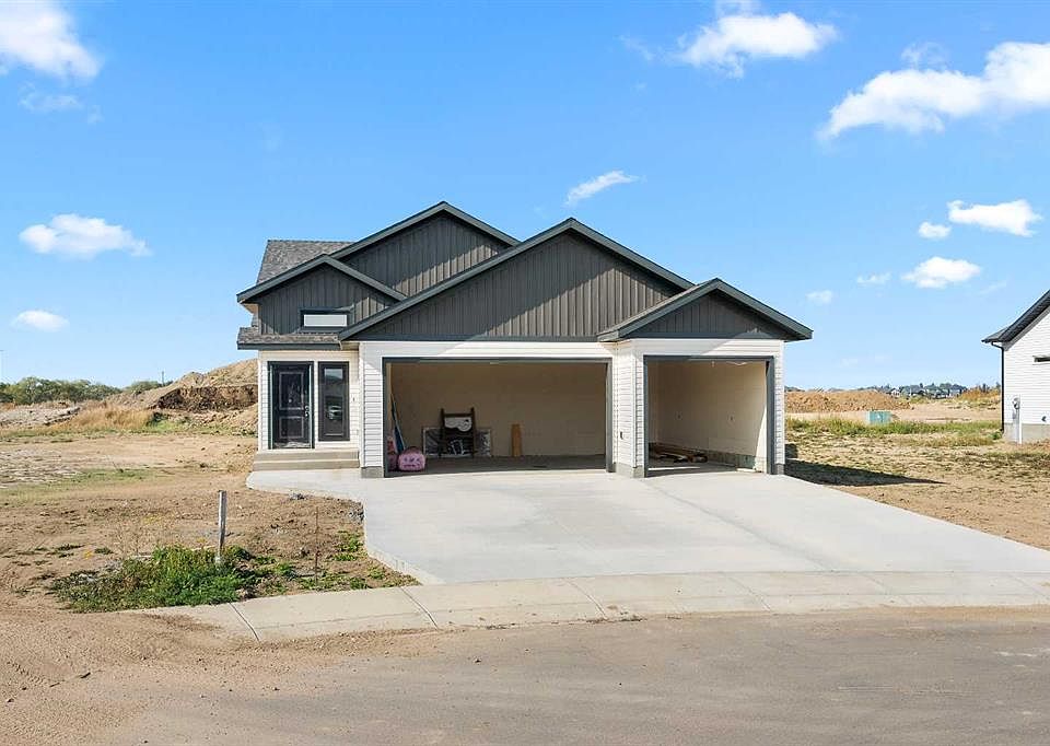 Triple attached garageColored overhead garage doorsVaulted ceilingsUpgraded kitchenOpen concept