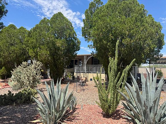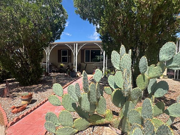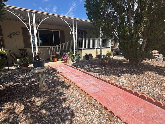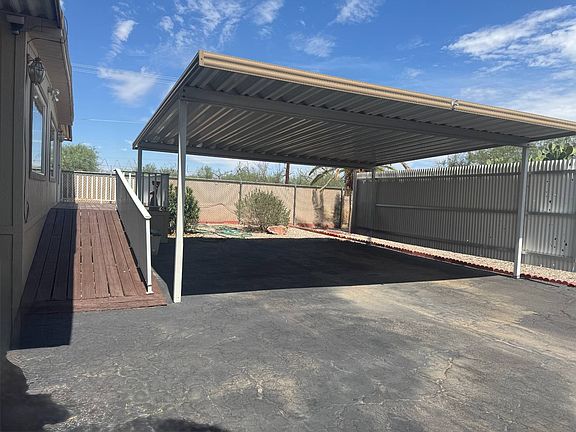 This move-in ready 1,728 sq. ft. home, which includes a 192 sq. ft. addition (per seller), is tucked away on a secluded cul-de-sac in the desirable Desert Pueblo community. Set on an oversized lot, it offers beautiful landscaping, an enclosed backyard for pets, and stunning views from every angle. The large driveway and double side-by-side carport provide plenty of parking for residents and guests alike, and security lights surround the home for added peace of mind. Step inside to a bright, inviting interior filled with natural light from abundant windows. The home features easy-care laminate flooring, a dinette, a formal dining space, and a tiled kitchen complete with a pantry and pull-out shelves. Just off the dinette, a cozy den with a wet bar adds flexibility for entertaining or creating a comfortable office space. You'll also enjoy the Arizona room, three decks, and a welcoming front patio-perfect for year-round outdoor living. The primary suite is generously sized and includes a walk-in closet along with an en suite bath featuring a walk-in shower. The guest bedroom is served by a second bath, which also features a walk-in shower for convenience. Thoughtful details like copper plumbing, a sturdy ramp alongside the steps, and ample storage throughout add both comfort and functionality. This home is truly move-in ready. Don't miss the opportunity to own this hidden gem in Desert Pueblo. Lot rent is subject to change based on current community rates.