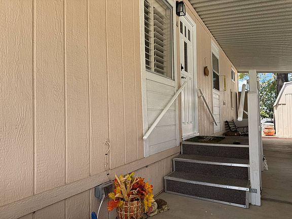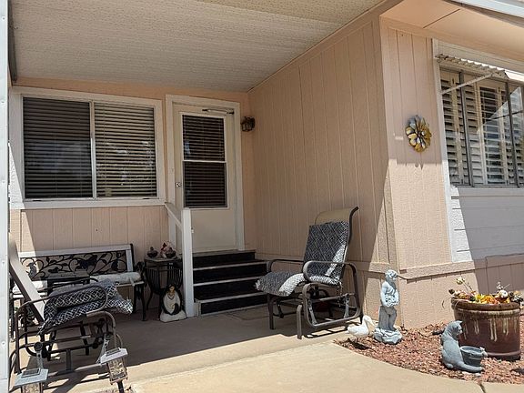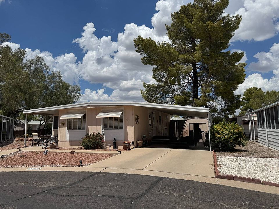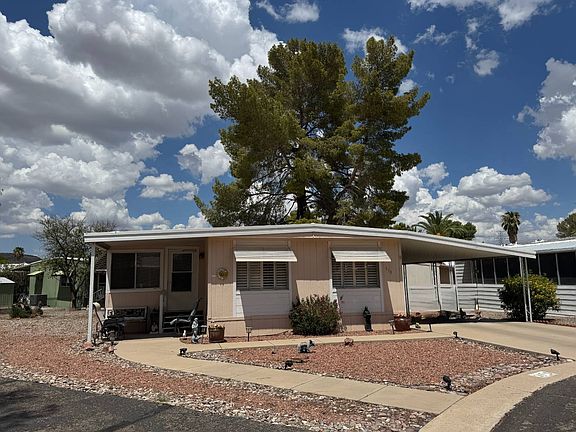 This is a rare fine in Desert Pueblo Community. A great buy. A 2 bedroom with 1.5 bathroom on a quiet cul-de-sac. It has great curb appeal including:1,420 sq ft (per seller). *Concrete Driveway *New T-111 hardboard siding *Insulated roof, metal with foam, then covered with a metal roof over entire house and carport *New in 2024 Heavy Duty HP unit both heating and cooling in electric *Nice size lot - Pride of Ownership shines, making this property truly special *5 Rooms for a total of 1,420 sq ft (per seller) *2 Bedrooms - Primary is spacious with a ceiling fan, and a walk in California closet, Guest Bedroom has a new murphy bed and closets *Sizable Formal Dining Room *Spacious Living Room has great light, a ceiling fan, wooden shutters, which are also throughout the home *Primary Bathroom is a true retreat with walk-in tub shower, new vanity, sink, mirror and new dual flush toilet with new plumbing *Guest bathroom has a new vanity, sink, mirror, with a dual flush toilet, and new plumbing The den or office has great light from windows adding an additional 180 sq ft (per seller) with new duct work *Interior has been freshly painted throughout *Kitchen remodeled in 2025 to include all NEW high end, stainless steel appliances: Refrigerator, Stove/Oven, Microwave, Dishwasher, Sink and Faucet, Disposal, Also new in 2025 Under Cabinet Lighting, Granite Countertops, Pull-out Cabinet Shelves, Lighting, Plumbing *Laundry area has storage *New in 2025 High Efficiency LG Stackable Washer and Dryer, Dryer is gas with new vent and gas lines *Flooring is tile in Kitchen and Dining Room *Laminate flooring in the rest of the home Desert Pueblo is a great place to call home and this particular home is a rare find, ready for you to move in and enjoy. Desert Pueblo has 24 hour security, great amenities, a calendar full of activities, and much more. The park boasts two clubhouses, 2 pools, fitness center, pickleball courts, monthly events, and water aerobics.