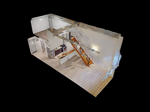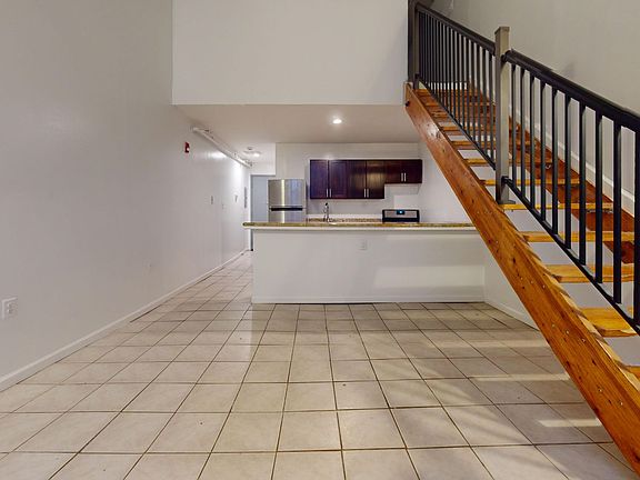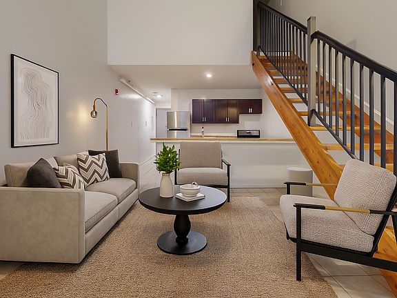 This 940 sq. ft. apartment in Philadelphia spans two floors, offering a versatile living space. The ground floor, measuring 500 sq. ft., showcases an open-concept design with a modern kitchen as its focal point. Dark cabinetry contrasts beautifully with stainless steel appliances and a light-colored countertop. The tiled flooring throughout the main level adds a touch of elegance and easy maintenance.