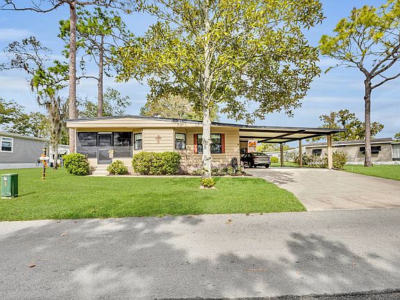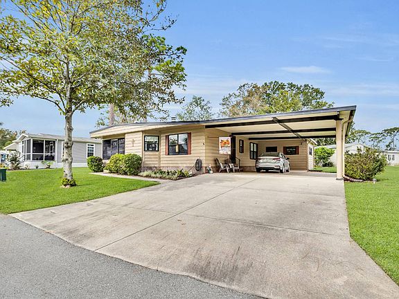 Enjoy resort-style living in this beautifully maintained manufactured home just under 3,000 sq. ft., perfectly situated across the golf course and only a short distance from the community recreation center. This home offers a generous dining area with built in storage, a large family room with a wet bar and fireplace. The kitchen features ample storage and counter space, perfect for entertaining or everyday living. The primary suite is spacious and private, with two walk-in closets, an ensuite with garden tub, double vanity and walk-in shower, and a large flex space ideal for an office, workout room or hobby area. The additional bedroom is well-sized, offering flexibility for guests or multi-purpose use. Enjoy peaceful mornings or relaxing evenings on the back patio or the vinyl enclosed lanai overlooking the greens. Enjoy the recreation center amenities of billiards, yoga/pilates, library, cards areas, weight room, tennis, pickleball, golf and three pools. With its prime location, expansive layout, and inviting atmosphere, this property offers exceptional comfort and convenience in a desirable community setting.