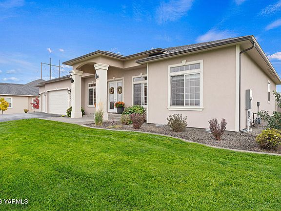 Introducing this remarkable single-level, 4-bedroom home with unbeatable views in all directions. As you enter the home, you'll immediately notice the stunning crown molding, soaring 12-foot ceilings and the cozy gas fireplace. The kitchen features a built-in gas range, double ovens and granite countertops. The primary bedroom is a sanctuary with its own stunning views of Mt. Adams, and it comes complete with a large en-suite bathroom and walk-in closet. On the other side of the home, you'll find two additional bathrooms and three bedrooms, each with their own large closets. A spacious den/office provides versatility, ideal for remote work or as a creative space. Step outside to the backyard, featuring a large covered patio, perfect for enjoying the stunning views of the mountains and orchards beyond. Perched on a hill and set back from the road, this home offers both privacy and easy access to nearby schools and amenities in a neighborhood perfect for evening strolls. Don't miss the chance to make this exceptional property your own.
