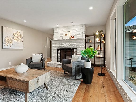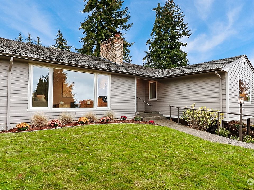 This mid-century home has light streaming in through new picture windows, capturing Sound & Mt views. You can enjoy a roaring fire, watching the sun set over the mountains. The just remodeled kitchen is stunning: herringbone tile backsplash, quartz counters, and high end stainless appliances make cooking a pleasure. The spacious dining room leads into the family room, perfect for watching TV or reading a book. The primary suite features a spa-like 3/4 tiled bath, rich and decadent. Wake up to boats sailing by. The basement is full of possibilities: huge 2nd family room has a fireplace, high ceilings and is ready for sheet rock. There's also room to finish out an office or flex space. Large backyard patio is perfect for entertaining.