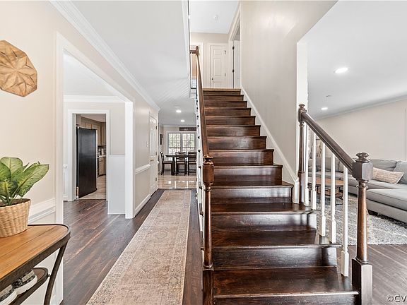 You're going to LOVE this 5 bed, 2.5 bath home with 2 car, side load garage in the highly coveted Carters Mill neighborhood of Chesterfield! As you enter the home you are greeted by beautiful hardwood floors throughout, chair rail & crown moulding through the hall, recessed lighting & a gorgeous wooden staircase. To the right you will find the oversized living room with a bright bay window, crown moulding, recessed lighting, & a stone accent wall with a built-in electric fireplace. Adjacent to the living room is the formal dining room that has chair rail picture & crown moulding with a bay window. The kitchen features tile flooring, granite countertops, island, soft-close cabinetry, stainless steel appliances, recessed lighting & a pantry with a half bath nearby. Through the French doors you will find the Florida room that has access to the large back deck & full privacy fenced in backyard. Upstairs there are 5 bedrooms all with walk-in closets, a 2nd floor laundry room that has built in shelving & a full hall bath. The large primary bedroom has a board & batten accent wall & an en-suite bath w/ jetted tub, separate shower, & double vanity. Finished 3rd floor with walk in storage!