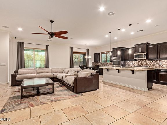 Beautiful mountain views and a serene desert backdrop! This stunning 3-bedroom, 2.5-bath home plus den sits in a desirable community offering multiple pools and a clubhouse. The open-concept kitchen features a huge island with breakfast bar, granite countertops, double wall ovens, gas cooktop, built-in microwave, custom tile backsplash, walk-in pantry, and upgraded cabinetry. The luxurious primary suite includes double sinks, a jetted garden tub, custom stone shower, granite counters, and a spacious walk-in closet. Enjoy low-maintenance landscaping front and back in a quiet cul-de-sac backing to the desert preserve. Recent updates include new A/C (2024), water heater (2025), and water softener (2025).