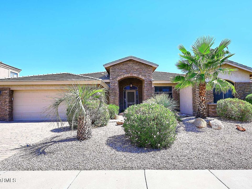 Great curb appeal showcases a paver drive and walk way with architectural stone accent facade. Spacious open floor plan with no steps, features soaring ceilings and immaculate tile flooring. Enjoy breathtaking views of Four Peaks Mountain range from ALL main living areas. Huge kitchen offers granite countertops, island, stainless appliances, built-in desk, and a walk-in pantry, opening to the family room with built in entertainment center and gas fireplace. Large primary bedroom includes a sitting area with pool access, while the luxurious master bath features an oversized jetted tub and custom walk-in tile shower. The private and tranquil backyard offers a sparkling heated pool with water feature, covered patio with non-slip deck, mature landscaping and mountain views.