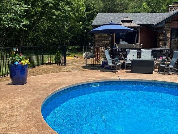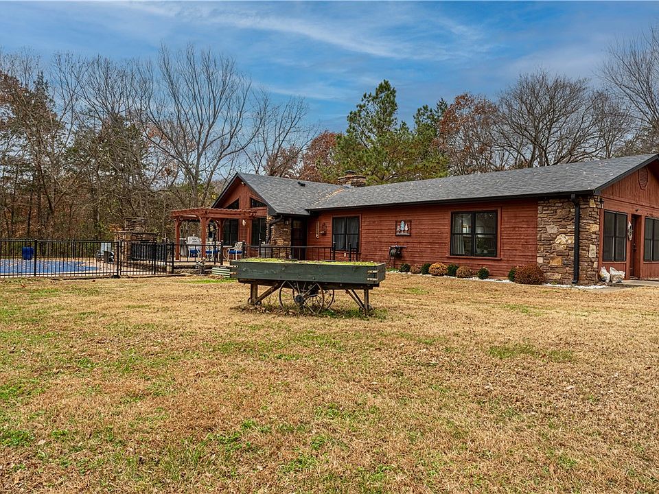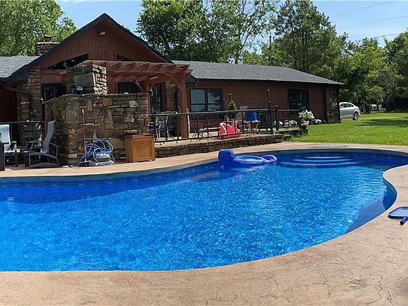 This one has it all! Beautiful and secluded 3 acres in the country but minutes from Fayetteville. Heated pool to lounge in and 40 x 40 shop heated shop building with extra 20 foot overhang and cozy inside with a huge stone fireplace in the large living room that is ducted throughout the home, dining room, and large open second living area, office or hobby room with lots of windows providing natural light. All new windows, guttering, and waterproof engineered vinyl flooring in 2018. New HVAC 2020. Saltwater pool installed 2020 with heat pump temp control, 3' to 6' sloping depth.