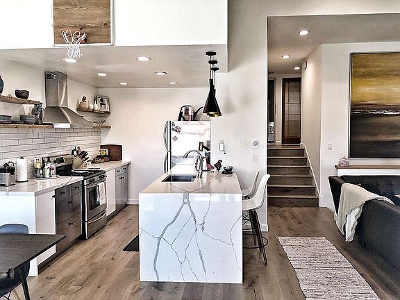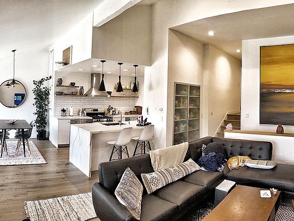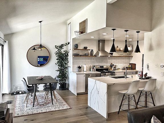 Surrounded by pristine landscaping and tucked away on a quiet street, this end unit home offers direct entry two-car garage with storage, easy street parking for guests, and a large private front patio. The charms of modern townhome living are enhanced by this spaces unique geometric angles, open living room, and expansive picture windows as well as its hardwood floors, upgraded fixtures, ultra-modern glass and tile bathrooms, and stainless-steel appliances. The minimalist kitchen with breakfast bar, pendant lighting, and white quartz counters whispers Japanese simplicity while the dining area with sliding glass doors to the bougainvilla-draped patio shouts Italian Riviera. The open floor plan offers unmatched versatility as either solitary and serene retreat or bustling and boisterous social venue. This sophisticated, beautifully remodeled two-bedroom townhouse is located in extremely popular Marina Del Rey, where beach-and-boat weekends complement easy-freeway-access weekdays.