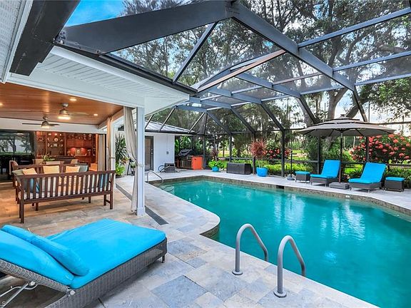 Claim one of Quail Creek’s most iconic addresses on renowned Valewood Drive, where comfortable luxury meets an irreplaceable connection to the community. As you arrive, a tranquil, zen inspired entry garden sets the stage: lush, meticulously curated, and highlighted by a banana orchard and an array of unique tropical plantings. The inviting floorplan is ideal for entertaining, with multiple living areas designed to accommodate gatherings large or small. Beautifully appointed ensuite bedrooms feature high end finishes, complemented by custom cabinetry, built ins, and one of a kind architectural details that blend function with elegance. Expansive windows and doors frame the stunning exterior vistas, where a heated pool and detailed tongue and groove ceiling work on the covered lanai creates the perfect outdoor retreat. The sustainable metal roof (2020) enhances long term appeal, while a full house 24KW propane gas generator and complete storm protection (shutters and impact glass) add a priceless level of convenience. Situated on an oversized lot, the home provides both privacy and ample space for outdoor enjoyment. Adding to its allure, the property is one of few that are just a short walk from Quail Creek Country Club, offering effortless access to championship golf, tennis, fine dining, and a vibrant social scene.