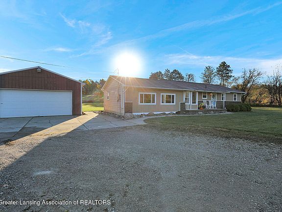 Welcome home to this well maintained, spacious ranch nestled on 2 charming acres! Inside you will find 2 large living rooms, perfect for entertaining or just relaxing by a fire. Step inside the spacious primary bedroom, which offers a private bathroom with a custom tile walk-in shower. The other 3 bedrooms are well sized and are complemented by another full bathroom which features a shower/tub combo. The kitchen and dining area feature luxury vinyl flooring, stainless steel refrigerator, dishwasher, and a beautiful bay window perfect for beautiful views while sitting around the table. The basement has an endless amount of space for storage, with endless possibilities for future buyers. Step outside and you will find a brand new stamped concrete patio, perfect for taking in the peaceful country setting, a beautiful pond, and garden. Inside the 20x40 pole barn/garage you will find it has everything: insulated, water, electricity, radiant heating, and a wall unit for cooling, perfect for any Michigan day. Plenty of space inside for 4 cars, ample amounts of storage which include an enclosed lean to attached to the rear of the garage. The possibilities for this pole barn/garage are endless! Recent updates to the home include: new furnace (2024), new water heater (2024), new well service line (2024), new chain link fence around the pond (2025), new stamped concrete patio (2025), new plumbing filters for the whole home (2024), freshly painted interior (2025)