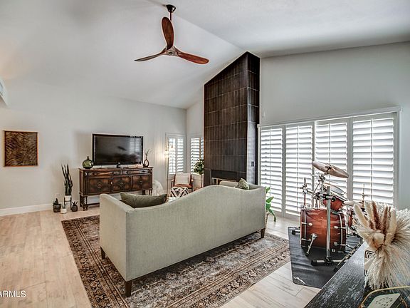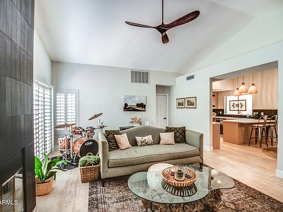 Incredible opportunity to purchase a completely remodeled home in great Ahwatukee 55 and older community. This open split floor plan boasts vaulted ceilings and great architectural details. Newly remodeled in 2023 with new kitchen consisting of quartz countertop, flat panel high end cabinets and stainless-steel appliances. Both bathrooms have all new vanities and updated tile flooring. Beautiful light neutral real wood flooring throughout. Wood burning tile fireplace is the focal point of the living room. Plantation shutters on every window including all three sliding glass doors. 2 Car garage with tons of storage cabinets and brand-new garage door. Freshly painted. New hot water heater and AC unit is only 4 years new. No detail has been overlooked. This home is move in ready!