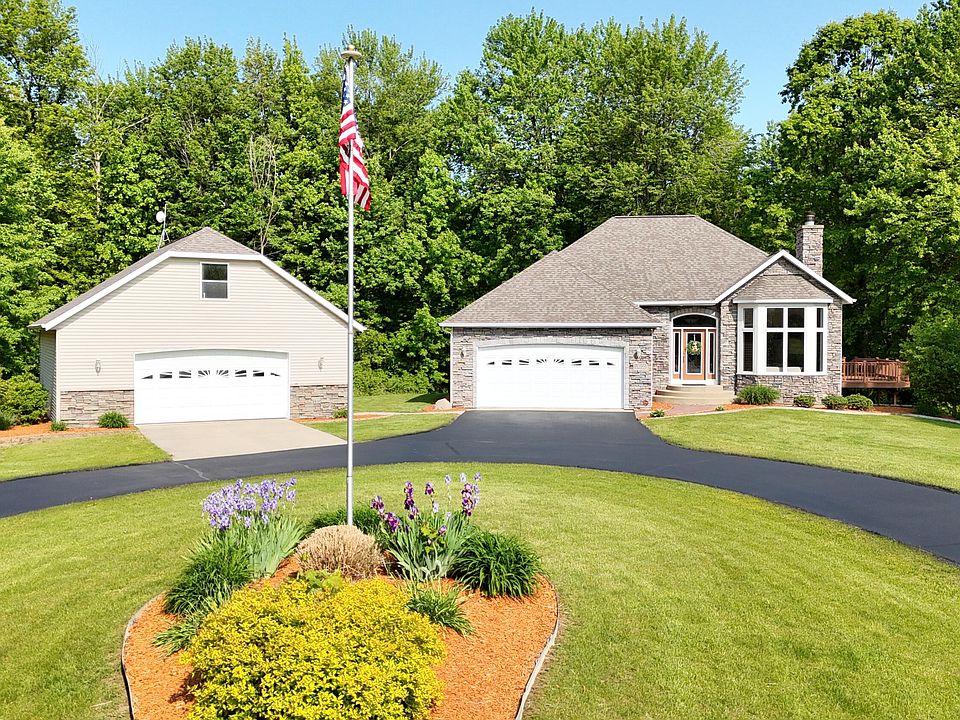 Escape to peace and privacy with this custom-built 3-bedroom, 2.5-bath home on 2.5 wooded acres featuring a stocked pond & abundant wildlife. The main level offers the living room with limestone fireplace, dining area, kitchen with stainless steel appliances, laundry room, & a spacious primary suite with two walk-in closets and private bath. The walk-out lower level is fully finished with 2 bedrooms, a full bath, & is plumbed for a bar. Enjoy the freshly stained deck, outdoor fire pit, horseshoe pit, and professionally landscaped yard. The 30'x32 pole barn includes a cement floor, electric, & loft. Recent updates include a newer roof, gutters, and a professionally sealed driveway. Central air, security system, and an additional 5.3 ac parcel is available for $175,000 (13027 Shaner).