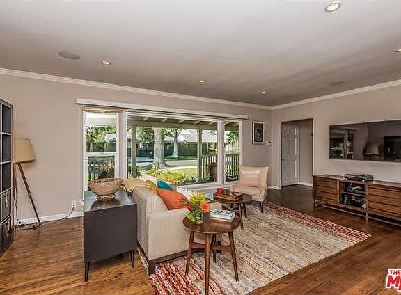 Beautifully updated 3 bedroom, 2 bath home with a sparkling pool and spa, located in the highly sought after Hidden Woods area of Sherman Oaks. A manicured front walk and expansive front porch lead into the spacious living room, which features an oversized picture window, wood floors, and crown moldings. Maple cabinetry, GE Caf~ appliances, and a custom pantry accent the tastefully remodeled kitchen. An open dining area leads out to fabulous outdoor amenities: a covered patio, built-in BBQ with bar and refrigerator, grass yard, and saltwater Pebble-Tec pool and spa. The third bedroom, currently used as an oversized den/ rec room, could be easily converted back to a master suite, and boasts wood-beam ceilings, a fireplace, and updated bath. Other upgrades include newer doors and Milgard windows throughout, Lutron lighting control, multi-zone audio throughout the house and back yard, and a 2-car garage with extra attic storage. Close to great schools, shopping, dining and entertainment.
