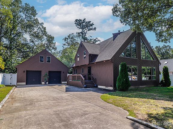 This is the home you have been waiting for! As you enter you are captivated by the cathedral ceilings & open floor concept. The 23ft stone fireplace with new 3D Deep dish electric fireplace insert has remote control multi color changing flame settings along with thermostat for desired heat is a focal point. Surrounded by the new incredible floor to ceiling peaked thermo windows filling the room with natural light. Along with all new flooring throughout the entire home. The beautifully updated kitchen features gleaming granite countertops, premium stainless steel appliances and custom cabinetry ideal for living and entertaining. This 3-bedroom,2-bath home is just a short stroll from Lake Barnegat Beach, Lower lake and Silver Cloud Harbor Marina. The private on-suite is secluded upstairs with a new Spa inspired bathroom with standing shower, contemporary toilet & waterfall vessel sink and color changing LED lighting. Step outside the primary bedroom to an updated private trek deck with modern cable railings for added space and style. Special feature is the detached oversized 2 car garage with central air & 2 zone heat with the potential to add a bathroom. Recently upgraded to a 200amp service a unique opportunity for an office, game room-entertainment space. Home was recently updated with newly installed Leaf Guard gutters on the home and garage. Windows were updated in 2024 and roof in 2018.This home is a Must see and Turn-Key ready!