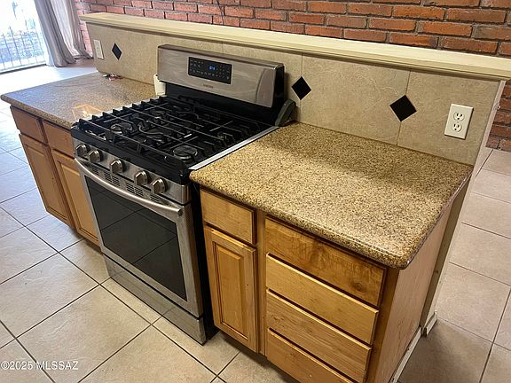 Arizona roomOpen floor planElegant counter topsGas rangeIsland kitchenTile flooringStainless steel appliances