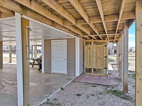 Under the home, you'll find a spacious enclosed shed area complete with a washer and dryer, offering secure storage for beach gear, bikes, and more.