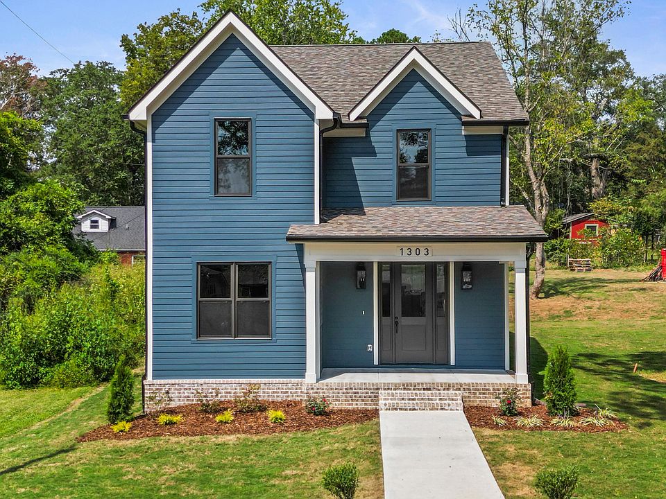 Welcome to 1303 W 53rd Street, a 4-bedroom, 3-bathroom residence in the heart of historic St. Elmo. This home pairs timeless neighborhood character with the conveniences of modern living. The exterior features a bold dark gray finish, a generous covered front porch, and oversized porch lights that create a polished first impression.