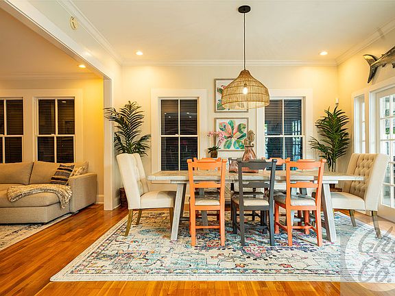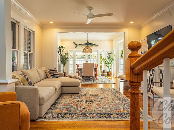 When you arrive the home, you are greeted with picturesque curb appeal. A white picket fence surrounds the commanding two story French Colonial home. Large wrap around decks complete Carolina blue ceilings, dramatic navy-blue plantation shutters, lush tropical landscape, mature canopy trees, the sound of birds whispering in the trees and the faint trickle of a fountain dripping into a small quaint pond below. You have finally arrived your own private paradise!