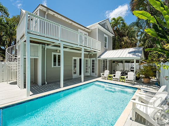 The fully manicured grounds are spread over 5, 000 sq ft and provide off-street parking for two cars. Mature palms are accented with landscape lighting to make the yard come to life after dark! The outdoor relaxation and entertainment areas are endless! The upper and lower large wrap around decks provide optimal views out to the Atlantic and Southernmost Point. A spacious rear deck surrounding the oversized pool also has a covered Pergola with ceiling fan and dining area. The last deck is accessible via a spiral staircase on the back pool deck or out the primary suite doors.