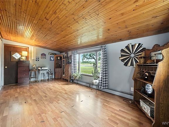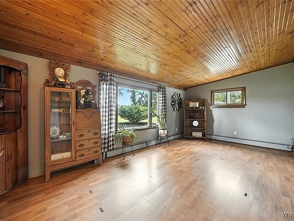 The spacious eat-in kitchen is perfect for everyday meals and entertaining, featuring abundant cabinetry, recessed lighting, a ceiling fan, and comes fully equipped with a stove and refrigerator. The inviting living room offers a warm and cozy atmosphere with its pellet stove, vaulted ceiling, ceiling fan, and skylight that fills the space with natural light. Designed with practicality in mind, this home includes a full bath and laundry area on the first floor, with a washer and dryer already in place for your convenience.