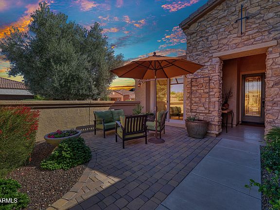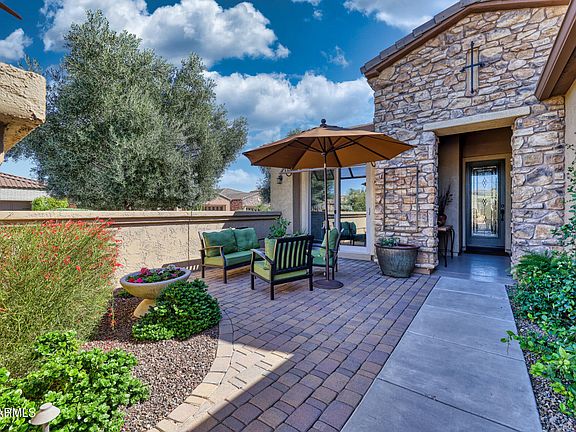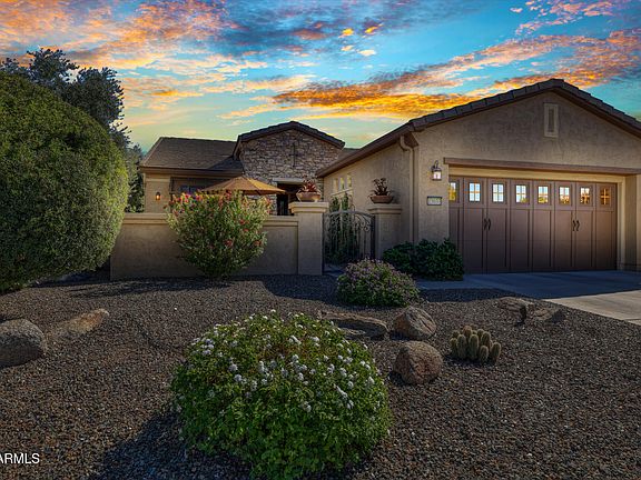 HONEY STOP THE CAR!  This GEM is a must-see!  A spectacularly updated Flora Model like no other!  It features a backyard highlighted by an in-ground spa, a sunken, pergola-covered, BBQ area, a firepit, an exterior entertainment  wall w/ a gas fireplace, & all of this on a travertine tile extended patio.  Not to be outdone by the exterior, the Great Room has a custom entertainment wall w/ electric fireplace;  the Kitchen has been totally redone w/ Painted cabinets, tile B/Splash, Quartz counters,  new sink & touch faucet, an extended island, a wine fridge, and Bosch Refer & Dishwasher.  The Den has built-in cabinets & a Murphy bed; the guest room has wainscoting, & there is a beautiful tile shower in the primary suite & both of the bedrooms have wood-look laminate floors & all these rooms are accented w/ crown molding.  The extended garage has epoxy floor, a wall of cabinets, & is home to a Central Vac system.  All of this on the preferred North-South oriented corner lot that sits above the road & is located in the award-winning Community of Trilogy at Vistancia.  This is truly a place that you will want to be YOUR Home!