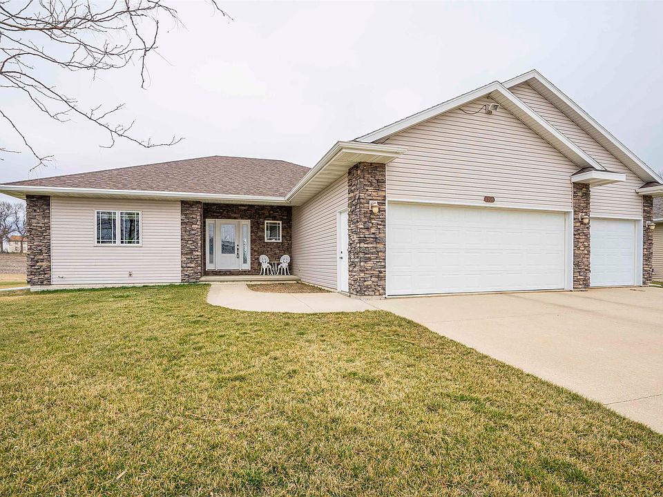 A custom built ranch style home located on the eastern edge of Le Mars city limits allows you the feeling of country living. The open floor plan is welcoming as you step inside the front door. A spacious living room with vaulted ceiling and gas fireplace is a great space for entertaining. And what better space to prep for a meal or party than in a custom designed kitchen? The cabinets are made of Liptus wood while the island provides workspace and extra seating. Appliances included are the double wall ovens, gas 5 burner stovetop, microwave, fridge, and dishwasher. The flooring in the kitchen and dining area is 3/4 inch Beechwood. A patio door from the dining leads you out to the large composite deck where you can enjoy beautiful sunrises with your morning coffee. Adjacent to the kitchen as you exit towards the 3 car attached garage, you will find a pantry closet, a coat closet and main floor laundry room. Laundry room has built in cabinets and a half bath. There are 2 bedrooms on the main floor: a master suite with walk in closet and private bath as well as a secondary bedroom and bathroom. On the lower level is a spacious family room with gas fireplace. At approximately 30 feet long, the possibilities are almost endless. Two additional bedrooms and a full bath are also on the lower level. The larger of those bedrooms has dual closets that are extra deep for storage. The mechanical room has more storage and a workbench that is negotiable. Updates to the home include: New roof and gutters on house and shed in 2023, new water heater 2020 and new garbage disposal 2024. 24 mo gas/elec avg: $149/mo. Closing date is subject to completion of seller's new home, expected end of June 2024.
