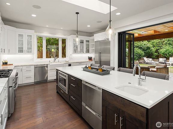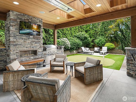 An inviting covered front porch & dramatic 2-story entry welcome you to this stylish, custom-built home. Designed to entertain, the expansive great room opens through 2 sets of Nano doors to a private outdoor oasis featuring a fully fenced yard, putting green & covered patio with heaters, gas fireplace, built-in BBQ & TV. Gourmet kitchen with stunning quartzite counters, high-end appliances & island with breakfast bar. Dining room with beverage bar & wine wall/closet. Main floor bedroom with adjacent ¾ bath. Spacious primary suite boasts a luxurious spa-like bath, large walk-in closet & French doors to a Juliet balcony. Bonus room with surround sound. Prime location close to Peter Kirk Elem & just blocks to Kirkland Urban & the waterfront.