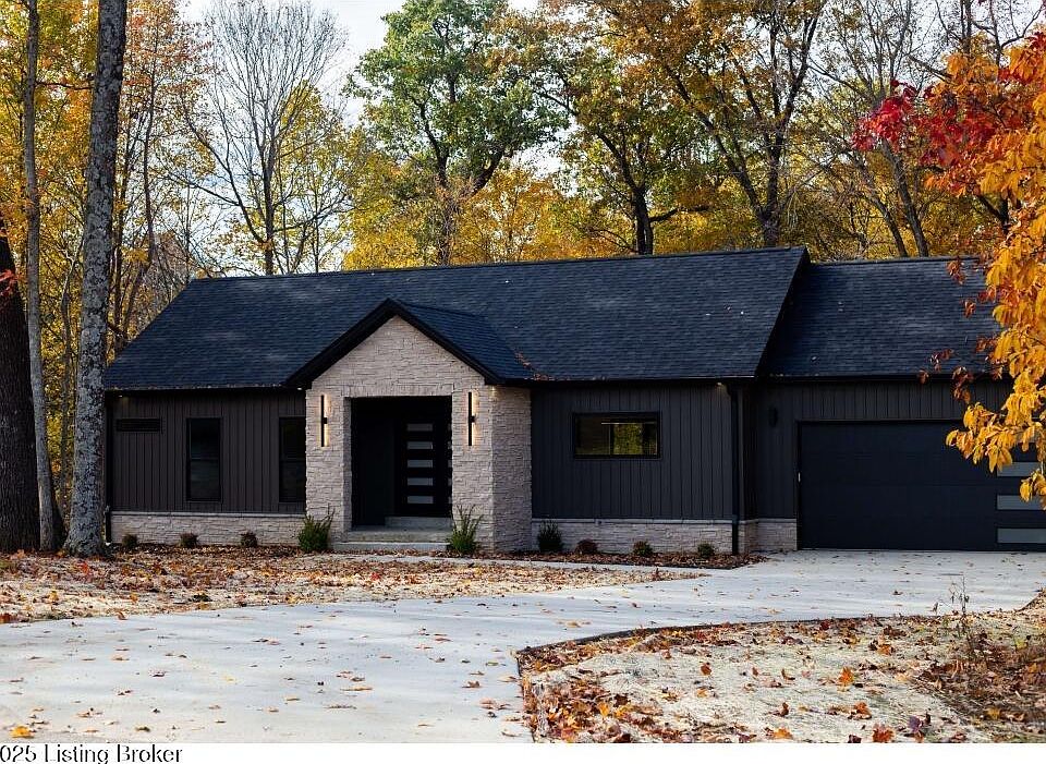 Experience Scandinavian-inspired modern living on a 2 acre wooded lot minutes from E-town and Fort Knox. This new home blends natural elements with clean contemporary design. Vaulted ceilings enhance the open main floor. The modern kitchen features matte black cabinetry, quartz counters, a center island with drawer microwave, stainless appliances, and designer lighting. This home features 4 bedrooms, 3 baths with a primary suite offering a custom shower, floating vanity, backlit mirror and heated tile floor. Additional highlights include abundant natural light, modern finishes, and a garage pre-wired for an EV charger. Private, tranquil and move-in ready.