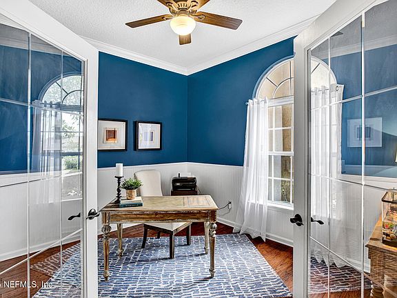 Quality built 5BR/4BA home in Eagle Harbor with 3,142 SF on a private cul-de-sac lot. Home boast 3-car garage, 12' ceilings, wood/tile flooring, additional dedicated office, and a spacious media/bonus room. The updated kitchen opens to the family room with views of the fenced backyard and large screened lanai—perfect for entertaining. Luxurious primary suite features a spa-like bath with soaking tub, oversized shower, and custom walk-in closet. Guest bath with outdoor access—ideal for a future pool. Fresh interior, open layout, and plenty of storage throughout. Enjoy resort-style amenities: 3 pools, golf course, tennis courts, clubhouse, and restaurant/bar. Zoned for top-rated Clay County schools with elementary nearby. Golf cart friendly with year-round events! Exquisite Executive Home in Prestigious Eagle Harbor