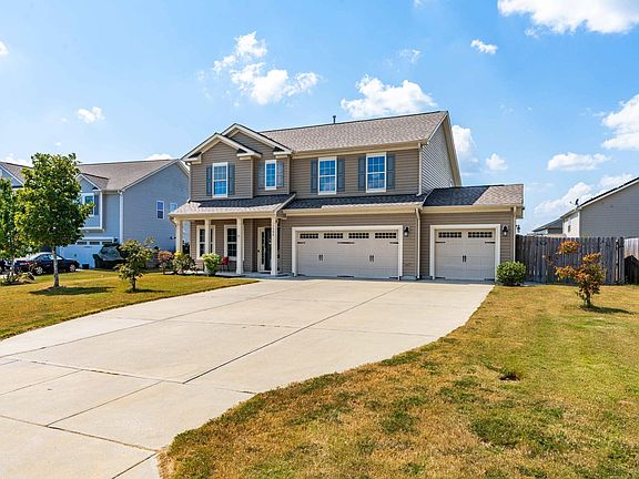 Move-in ready, spacious, and full of charm! This stunning 5-bedroom, 3.5-bath home with a 3-car garage is located in the desirable Amber Ridge community of Fuquay-Varina, Wake County. Inside, enjoy fresh paint and brand-new carpet throughout, creating a bright, welcoming atmosphere. The gourmet kitchen features a large island with storage and flows seamlessly into the family room, filled with natural light—perfect for everyday living and entertaining. A separate dining room offers flexible space for formal meals or a home office. The first-floor primary suite provides a spacious ensuite retreat. Upstairs, four additional bedrooms and two full baths include one bedroom with its own ensuite—ideal for in-laws, teens, or overnight guests. Outside, the fenced backyard is an entertainer's dream, complete with a fire pit, pool table, and swim spa for private fun and relaxation. Combining style, space, and convenience, this Amber Ridge home delivers the complete package in a sought-after location.