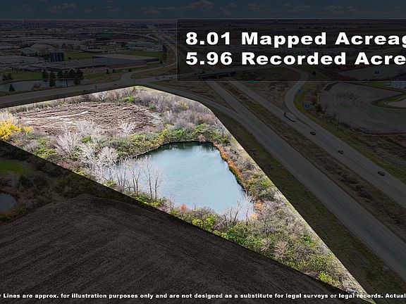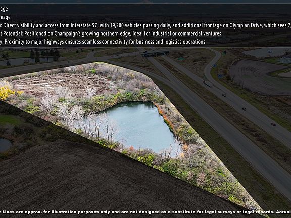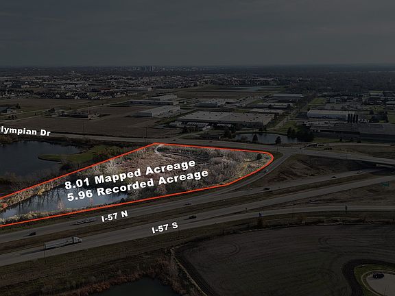 8.01 acres total. 5.96 are buildable. 2 acre pond included in the 8 acres. Strategic location- Direct visibility and access from I57 with 19,200 vehicles passing daily and additional frontage on Olympian Dr. which sees 7,600 vehicles daily. High development potential- positioned on Champaign's growing Northern edge, ideal for industrial and commercial ventures. Proximity to major highways ensures seamless connectivity for business and logistics operations.