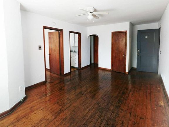 Both the living room and bedroom have hardwood flooring. The galley style kitchen has an apt. sized electric stove and refrigerator. The bath has a shower--no tub. The building has continuously circulating hot water and a coin op laundry is available in a common basement. There is some off-street parking on a first come basis--free curbside parking is also available. Heat and water included in the rent. No dogs-no smokers please. Public transportation is readily available.