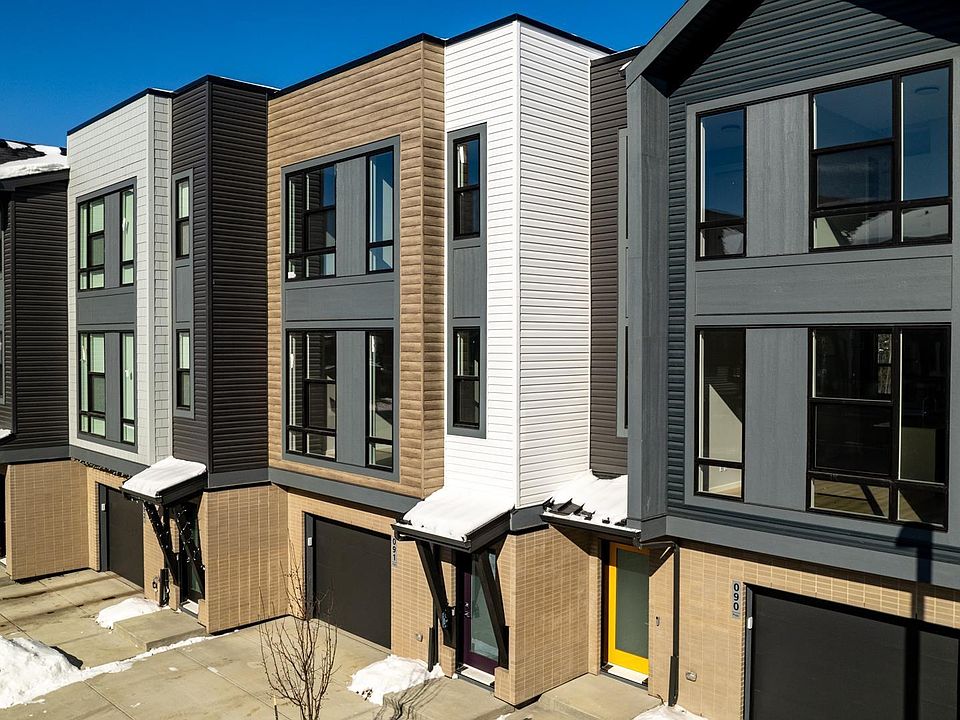 Experience maintenance-free living in the desirable Southwest community of Rutherford. This spacious 3-storey townhouse offers over 1500 sq ft of bright, modern living with floor-to-ceiling windows and stylish vinyl plank flooring. The open-concept main floor features a sleek white kitchen with quartz counters, a pantry, and plenty of space to entertain. Enjoy the comfort of “yours and mine” ensuite sinks, upper-level laundry, A/C, LED lighting, and abundant storage. The large primary bedroom is filled with natural light, complemented by two additional generously sized rooms—ideal for kids, guests, or a home office. With a single attached garage, tandem driveway parking, and close proximity to schools, parks, and everyday amenities, this home blends contemporary ease with community convenience. SOME PHOTOS ARE VIRTUALLY STAGED.