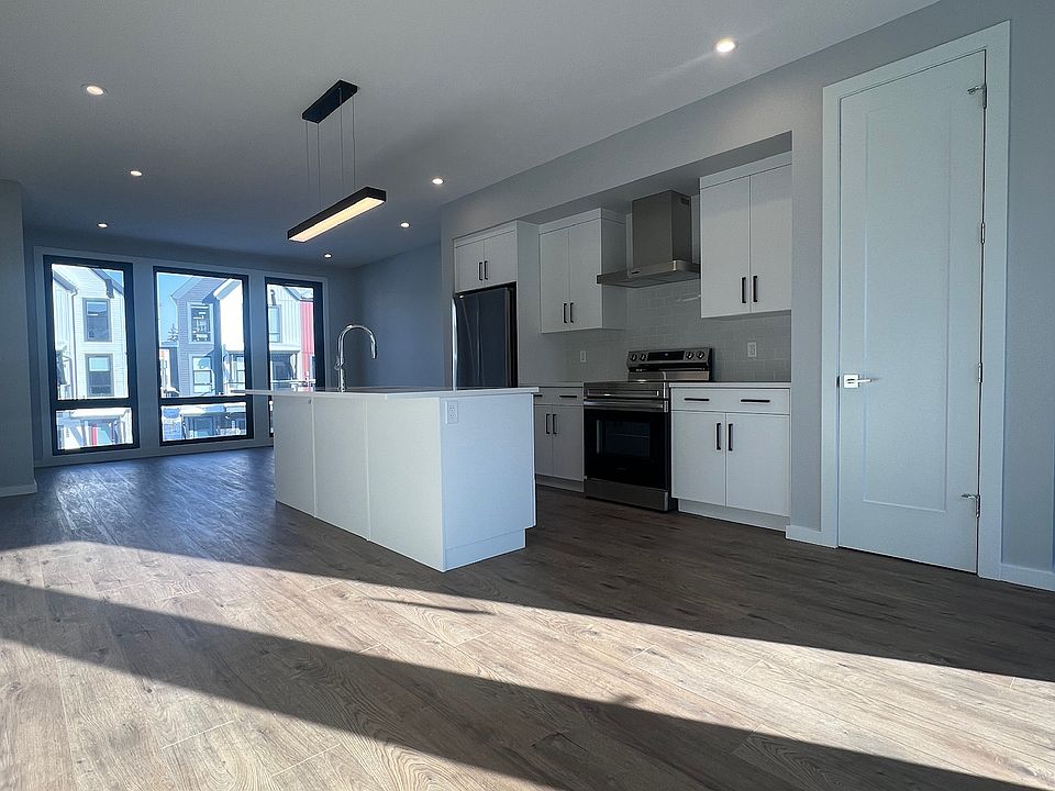 Make your new home this modern 2 bedroom townhouse which demonstrates elevated design and quality and backs onto quiet walking trails. On the ground floor, you have two car (tandem) attached garage and open entryway with large closet and a patio area out back of the garage. On the second floor you will walk into your open living space with floor to ceiling windows and nine foot ceilings. This floor includes a large, open concept living room, dining room and kitchen, which boasts crisp white cabinetry, quartz countertops, a large island with black silgranit sink and an upgraded stainless steel appliance package and a bright half bath. Off the kitchen is a large deck, one of your three outdoor living spaces. On the third floor you will find two large primary bedrooms, each with a large walk in closet and ensuite, your laundry and linen closet for additional storage. One more flight of stairs will take you to your private rooftop patio.The unit is bright and open with floor to ceiling windows and open riser staircases. The main floor entryway and two full bathrooms have beautiful tile floors, the stairs and bedrooms have carpet, and the main area of the home has laminate floor. Call today for a showing and see what the community of Pivot has to offer!