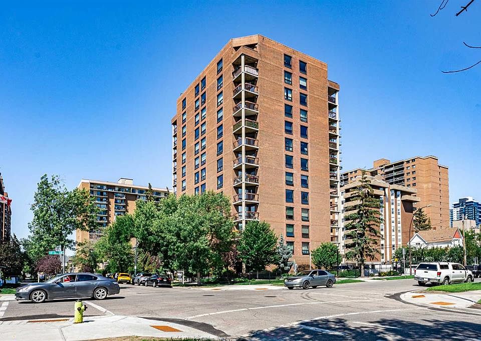 Experience elevated downtown living in this expansive 1,315 sq. ft. penthouse, located in a well-maintained concrete and brick building in Calgary’s vibrant Beltline. With sweeping city views, modern upgrades, and a highly walkable location, this 2-bedroom, 2-bathroom corner unit offers a rare blend of comfort, functionality, and classic charm. Inside, you will find hardwood flooring and a striking wood-burning fireplace with a marble surround. Oversized windows fill the spacious living and dining areas with natural light, creating a warm and inviting atmosphere. The well-maintained kitchen features generous cabinetry, a built-in wall oven and microwave, and a recently replaced refrigerator. The primary suite offers three closets and a spacious 4-piece ensuite with updated tile, flooring, and modern faucets. The second bedroom is adjacent to a fully renovated 3-piece bathroom with a standing shower, updated finishes, and contemporary fixtures. Enjoy panoramic downtown views from your private balcony. Additional features include a full laundry room, one underground parking stall, and a dedicated storage locker. This pet-friendly, professionally managed building is located just steps from the best of 17th Avenue, restaurants, cafes, shops, parks, and public transit. Penthouse units with this layout, level of care, and character are rarely available. Book your private showing today.