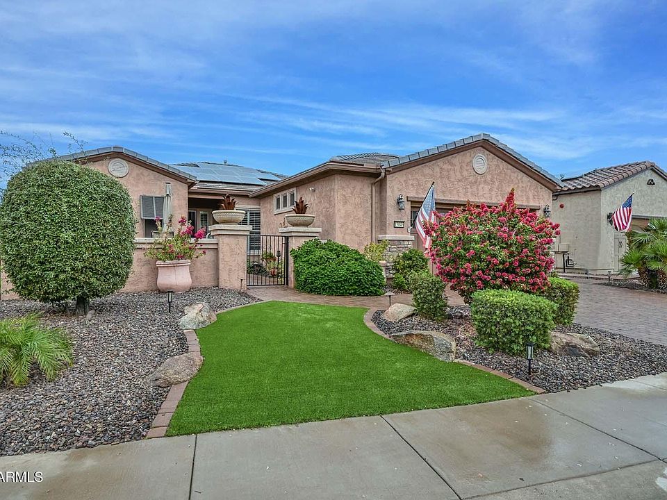 Spectacular & Charming well maintained Libertas model features an oasis DREAM BACKYARD with a luxurious four-hole PUTTING GREEN, large Turbo BBQ island, large patio with extended pergola and remote patio shade along with a new misting system and a beautiful water feature. Home displays 10-ft ceilings & tile flooring. The kitchen has Granite countertops, huge island & on full backsplashes, quality updated cabinets w/rollouts, & stainless Samsung & GE appliances & refrigerator-NEW 2023. The primary suite has a, large walk-in closet, bathroom with tiled shower and dual sink counters. Guest bedroom and bath are split from the primary suite. The versatile den/office features a custom built desk & wall shelves. The laundry room features Samsung washer & dryer
