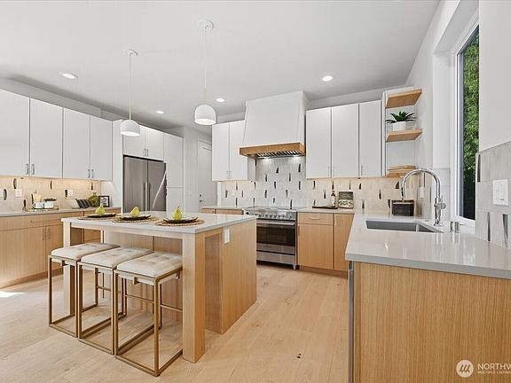 Cedar Park at its finest. Located on the bluff street in Cedar Park, this sunrise facing new construction offers a glimpse view of Lake Washington with an abundance of natural light and beauty. Designer curated interior boasts Fisher Paykel stainless steel appliances, quartz countertops and undercounter lighting. First floor living room, kitchen and dining room offer easy access from the oversized 2-car garage. 3 bedrooms on the second floor including the primary suite with heated floors in the bathroom and a deck. Third floor has a fourth bedroom, bath and a generous family/Superbowl room with sink and beverage frig. 18x12 partially covered deck perfect for a Seahawks party.
