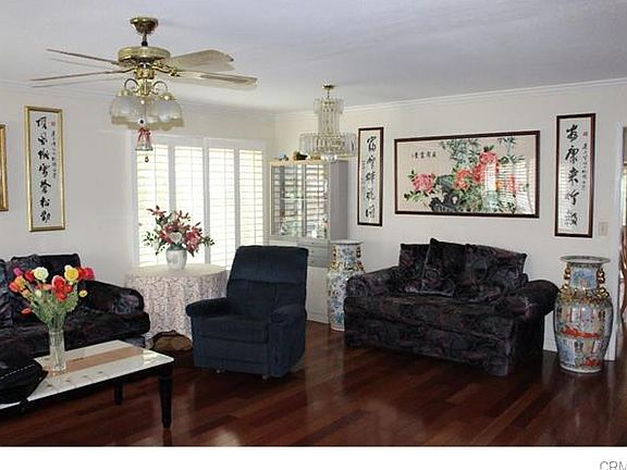 Nice remodeled house right behind is Whitney High School, belongs to Stower Elementary School, Camenita Middle School and Cerritos High School. One level with 4 bedrooms, 1 and 0.75 bathrooms plus enclosed patio in the total close to 2000 sft. and two car garage attached under red tile roof. Carrier Comfort/Zoning control central AC/heater; Ceiling fans in all areas; Security Alarm System installed; Laundry room in house, Milgard double pane windows and sliding door, Cherry Hardwood Floor through the entire house except travertine stone tiles for bathroom floors; wood window shutter, ceiling/floor hard wood molding; Beech wood cabinets with granite counter top on bathroom and kitchen; granite slap on bathtub and shower wall; Fire place in dinning area; master room with walk in closet ;over 12 fruit trees and rose bushes in the back/front yards; timer sprinkler in the front yard and manual sprinkler in the back yard; drinking water filter in the kitchen sink and water softener filter installed; Walking distance to the Park East with track field, baseball field. Tennis courts, picnic areas and the Olympic indoor heated Swimming Pool; Close to Cerritos Town Center, Performance Art Center and the Cerritos Library; and 91/605/5 free ways.