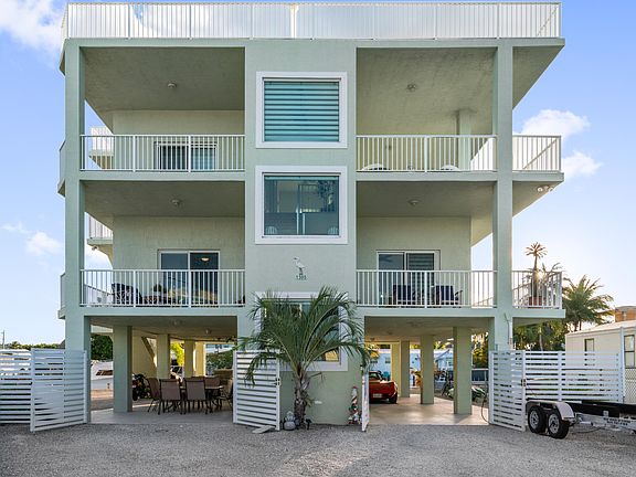 Experience next-level waterfront living in this beautifully modern, solid concrete home showcasing sweeping Bay views and designed to maximize the island lifestyle. Covered patios and terraces provide stunning vistas from every angle, perfect for entertaining or unwinding in total serenity. An open rooftop deck crowns the home, offering breathtaking 360-degree views and a front-row seat to spectacular sunrises and sunsets.The property features 97 feet of protected concrete dockage and seawall with davits, delivering immediate Bay and Ocean access via the nearby Adams Cut Waterway, ideally positioned within the coveted Golden Triangle of Boating. The first floor boasts a beautiful outdoor kitchen ideal for waterfront entertaining.Inside, a striking interior staircase leads to the main living level, where a generous open-concept layout blends the living, dining, and kitchen spaces, all framed by breathtaking water views. The primary suite is a true retreat, complete with a newly renovated shower, sleek glass vessel sinks, and modern finishes.Additional highlights include impact-rated windows and doors throughout, 299 sf of storage, updated A/C units and a bonus mini-split in the primary bedroom for added comfort.Located just minutes from Key Largo's most popular waterfront restaurants and attractions, this home delivers the perfect balance of modern design, peace of mind, and effortless Keys living.