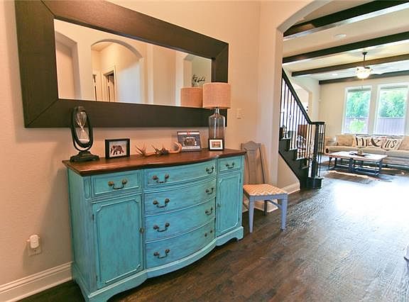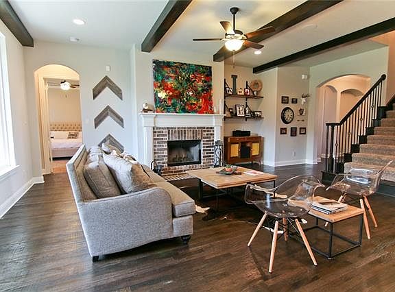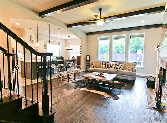Custom home built in 2015 in the awesome gated community of Texanna Ranch! Features wood floors, neutral paint, open concept floor plan & brick FP & wood beams in the family room. Gorgeous kit w granite, ss applcs, lg center island & bkfst bar. Master, 2nd bed & office down, which could be used as the 3rd bed. Upstairs is a lg room that could be used as a game or media room w half bath. Relax by the outdoor fire pit on cool evenings. Huge yard with inground pool, Pergola with roof And lots of decking. Shutters through out.