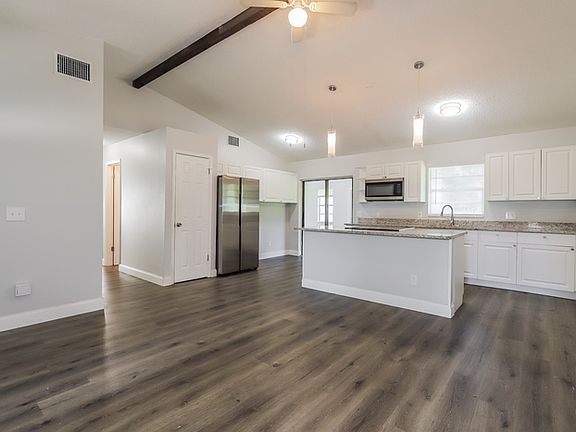 Out back, a spacious backyard and patio area provide the perfect space for outdoor furniture, gatherings, or simply enjoying the Florida sunshine.