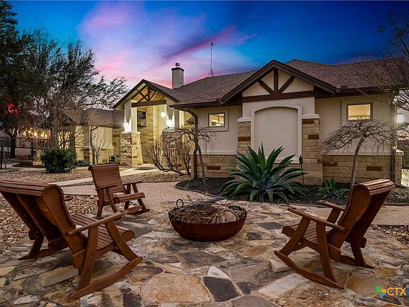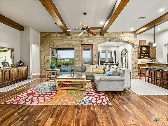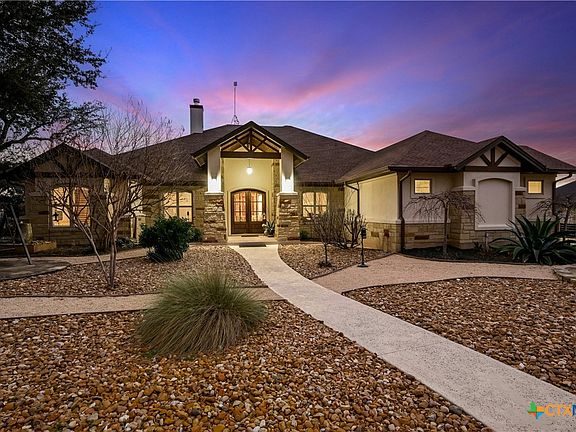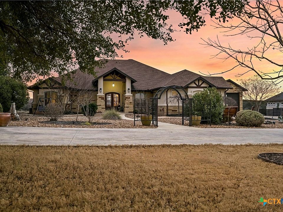 This stunning 1.66-acre estate offers unparalleled tranquility, backing to Corps of Engineer land near Lake Georgetown. With lush landscaping, breathtaking sunsets, and resort-style outdoor living, this home is a true Texas retreat. One-story with 4 beds, 4 full baths, two home offices and a bonus/game room. The front yard features a fire pit, raised garden beds, and native, drought-tolerant landscaping for beauty with low maintenance. In the backyard, enjoy a heated pool with waterfall features year-round while taking in panoramic greenbelt views. The covered patio is an entertainer’s dream, with a soaring cedar-paneled ceiling, stone fireplace, built-in BBQ, and roll-down sunshades. Inside, a large picture window in the family room frames the incredible backyard views. The living area features a stone fireplace, built-in cabinetry, recessed lighting, and stunning cedar beams. The chef’s kitchen is a showstopper with Knotty Alder cabinetry, TWO dishwashers, a commercial-grade six-burner cooktop & double convection ovens. Two dedicated home offices offer versatility for remote work, a hobby space, or a yoga studio! The primary suite is a private retreat with patio access & a dreamy bathroom. The bonus room is a perfect gem to have in this large one-story floorplan. It gives you that “extra” living space that you can do so many things with and a lot of times miss having in a one-story. This could be a media room, a home-gym, a gameroom with a pool table, a kids retreat, etc! Two guest bedrooms include en-suite bathrooms and walk-in closets. The laundry room is built for convenience w/custom cabinetry, basket cubbies, a broom closet, a utility sink, and space for a full-size refrigerator. The three-car garage features epoxy flooring, water softener hookups, and an oversized bay for large vehicles. A separate RV/boat garage makes this home perfect for outdoor enthusiasts—just ½ mile from Lake Georgetown! Don't miss this opportunity!
