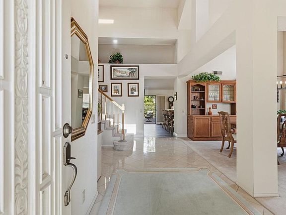Fabulous cul-de-sac Shadowridge home with primary suite and all essential rooms (including laundry) on the main floor offering the ease and comfort of single-level living. *** Open floor plan with great architectural detail and abundant natural light featuring high vaulted ceilings, porcelain plank floors, marble entry, plantation shutters, and cozy fireplace. *** Kitchen boasts Corian countertops, center island, double ovens, built in microwave, LG French door refrigerator and plenty of storage. *** Additional features include owned solar, AC, ceiling fans, NEST thermostat & ring, oversized 2-car garage. *** Large private lot with generous back and side yards are highlighted with tiled patio perfect for that morning coffee, family barbecues or basking in the California sun! *** Close to Shadowridge Golf Club, parks, downtown Vista or access to 78.