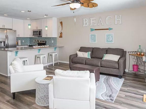 Escape to the beach at this coastal-themed third-floor condo! Watch the sun rise over the ocean and set over the canal from your two private balconies. Walk half a block to the public beach access for fun days splashing in the surf and relaxing on the sand. Private parking area at the rear of the building.